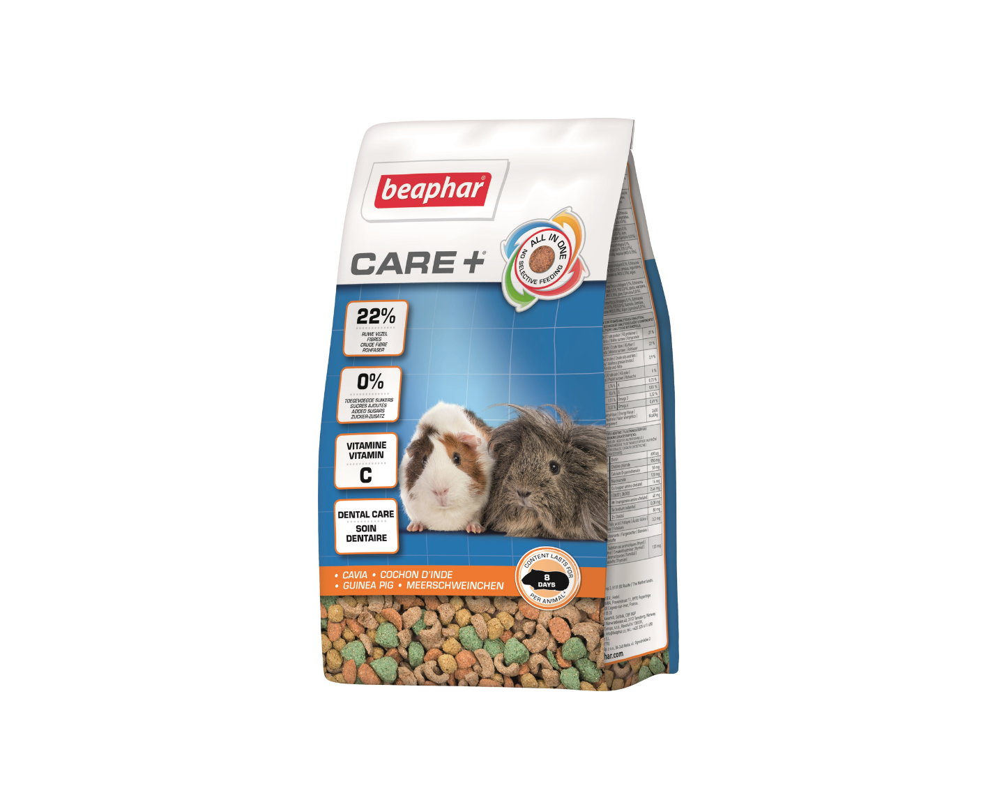 Повноцінний екструдований корм супер-преміум класу для морських свинок CARE + має високий вміст вітаміну C  і клітковини. Кожна гранула має однаковий склад («все-в-одному»). Це важливо для збалансованого харчування і запобігання вибіркового поїдання без залишку. Спеціальні тверді гранули забезпечують природне сточування зубів (Dental Care).