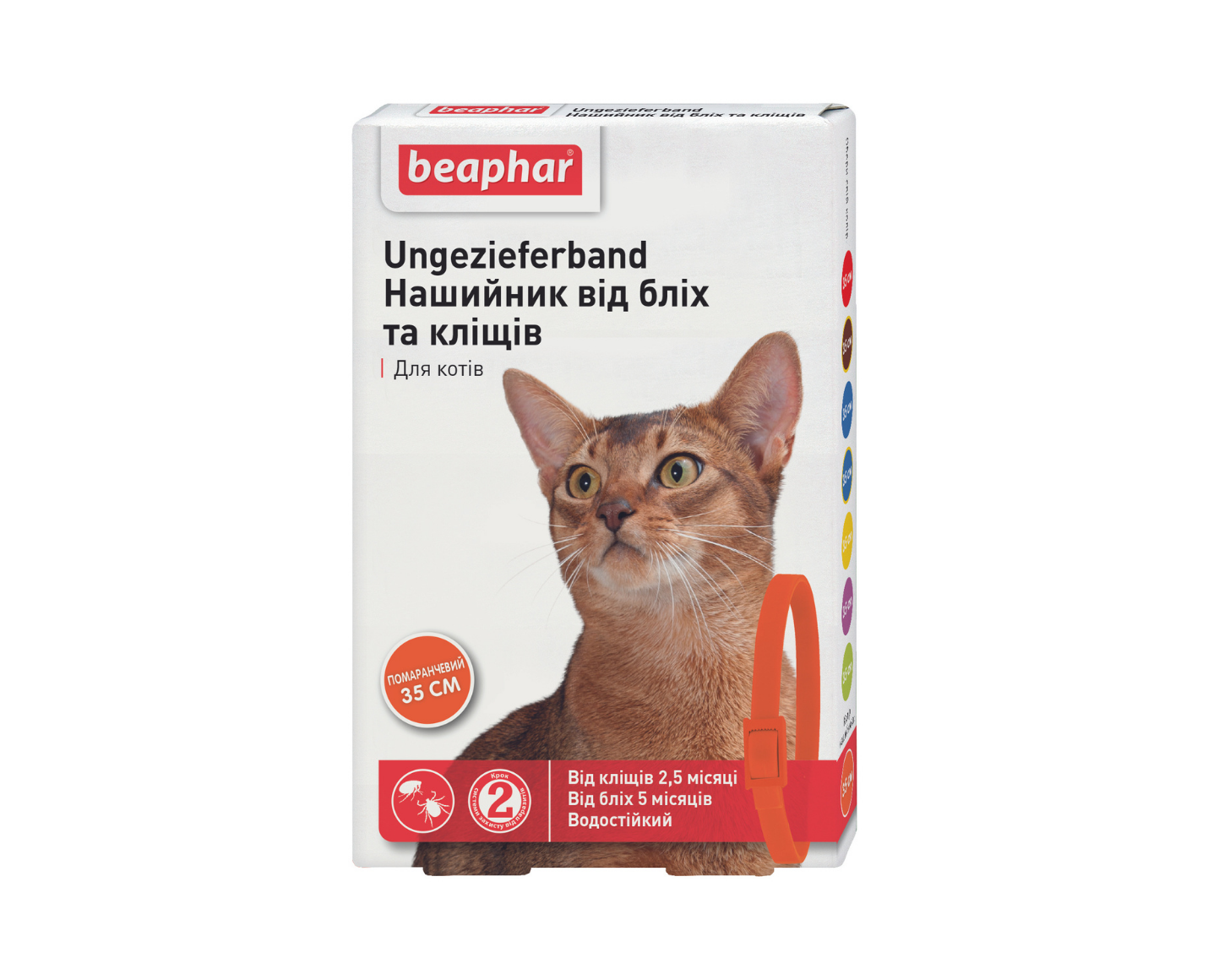 Нашийник Беафар від бліх і кліщів для котів та кошенят віком від 6 місяців. Нашийник являє собою поліхлорвінілову стрічку з фіксатором і насічками, які сприяють моментальному розтягуванню ошийника і швидкому звільненню тварини. Колір нашийника – помаранчевий, нашийник водостійкий, довжина 35см. Знищує паразитів і захищає від повторного зараження блохами протягом 5 місяців і кліщами 2,5 місяці. Діазинон в складі нашийника виділяється з поверхні стрічки, переноситься на шкірно-шерстний покрив тварини і накопичується в епідермісі, волосяних цибулинах, сальних залозах. Поступово вивільняючись на поверхню шкіри разом з секретом залоз, діазинон має інсектоакарицидну і репелентну дію на бліх, вошей, волосоїдів та кліщів, що паразитують на тваринах. Механізм дії призводить до паралічу та загибелі паразитів.